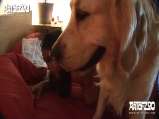 Big tits woman in mask licked by dog
